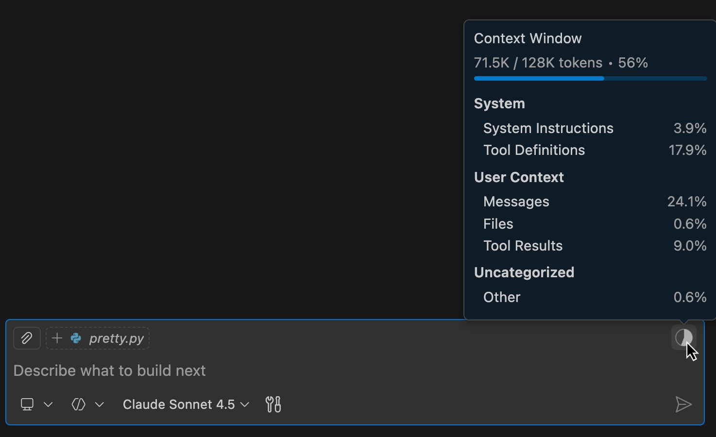 The tools and interfaces are getting better rapidly. VS Code’s Copilot just dropped a more helpful session context button since my last update, and Gemini on the web and native apps finally has the ability to search previous chats.